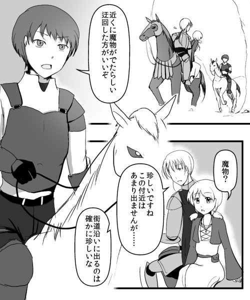 しばらくは3人での賑やかな旅になりそうですが、どうなることやら。とりあえず描くのが大変だった馬がさらにもう1頭増えて若干ヒイヒイ言っています。