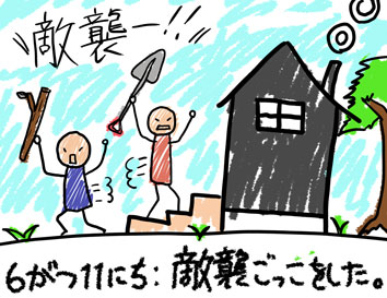 「敵襲ーっ!!」と叫びながら、父と一緒に家の周りを駆け回る