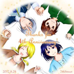 7thStreetは今日で4歳の誕生日を迎えました! 4周年記念のイラストをサイトより先にブログに挙げちゃいます。サイトの方の更新は、午後にでも行おうと思います。私が睡魔に打ち勝てれば!(笑)もし睡魔に負けたら更新は夜になります…。