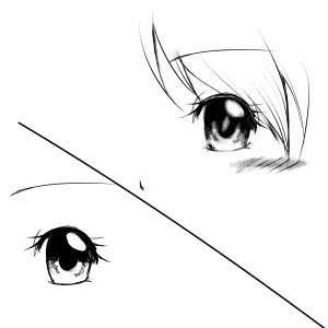 お目目の描き方を模索中。左下が従来の描き方、右上が改善案。